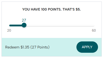 At checkout, you’ll be able to use a slider bar to choose exactly how many points you’d like to apply. As you slide, you’ll see the point amount and dollar value update in real time. Just click Apply, and you’ll be set!