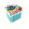 Holds up to 96 blender brushes. Measures 5 ⅝ x 5 ⅝ in. square and each hole measures ½ x ½ in. Assembly instructions included.
