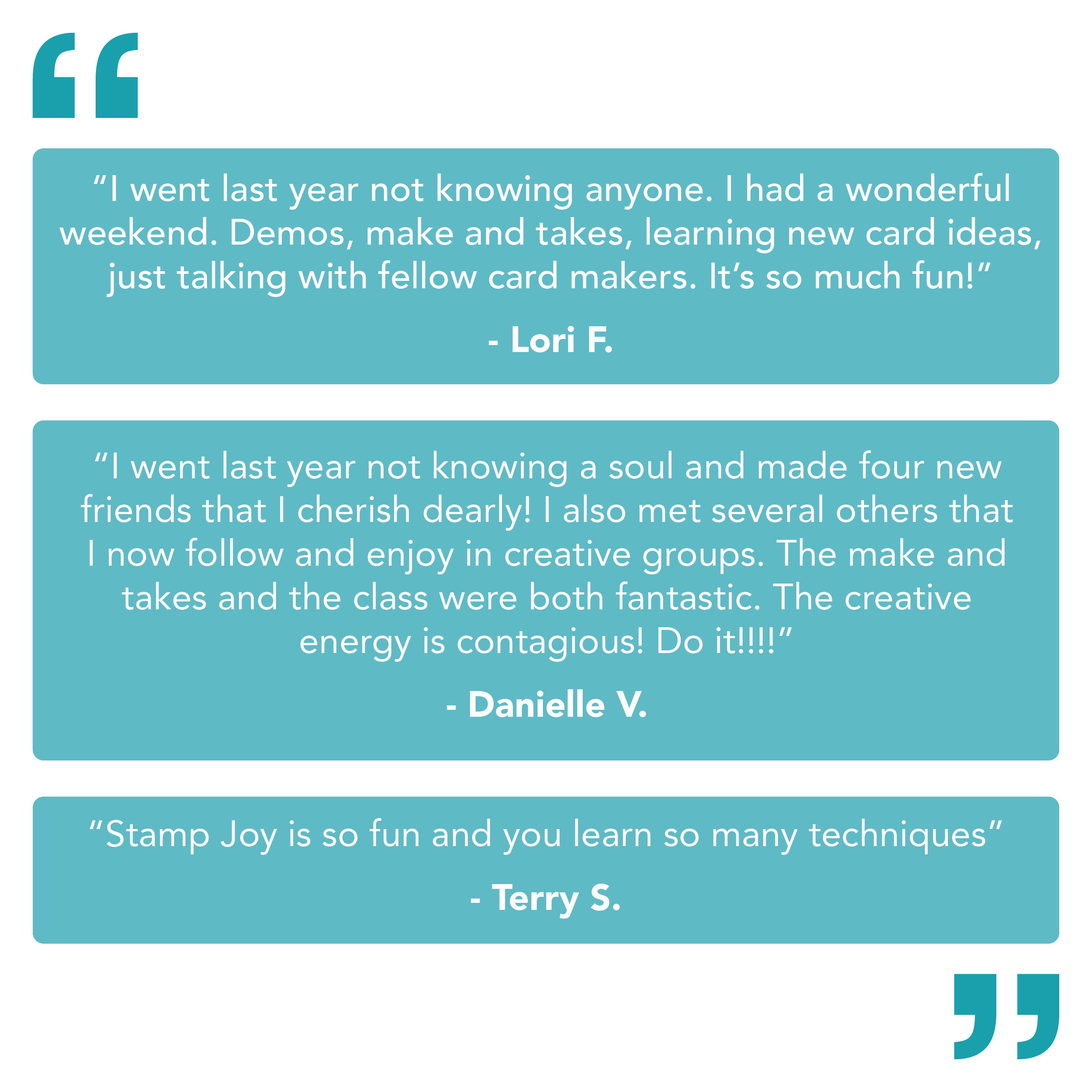 The Stamp Joy Card Swap is an optional activity where you’ll bring 25 handmade cards to share with fellow crafters. During the swap, you’ll trade your cards with others—so, you’ll leave with 25 brand-new cards made by other crafty friends! Check back soon for more Card Swap details!