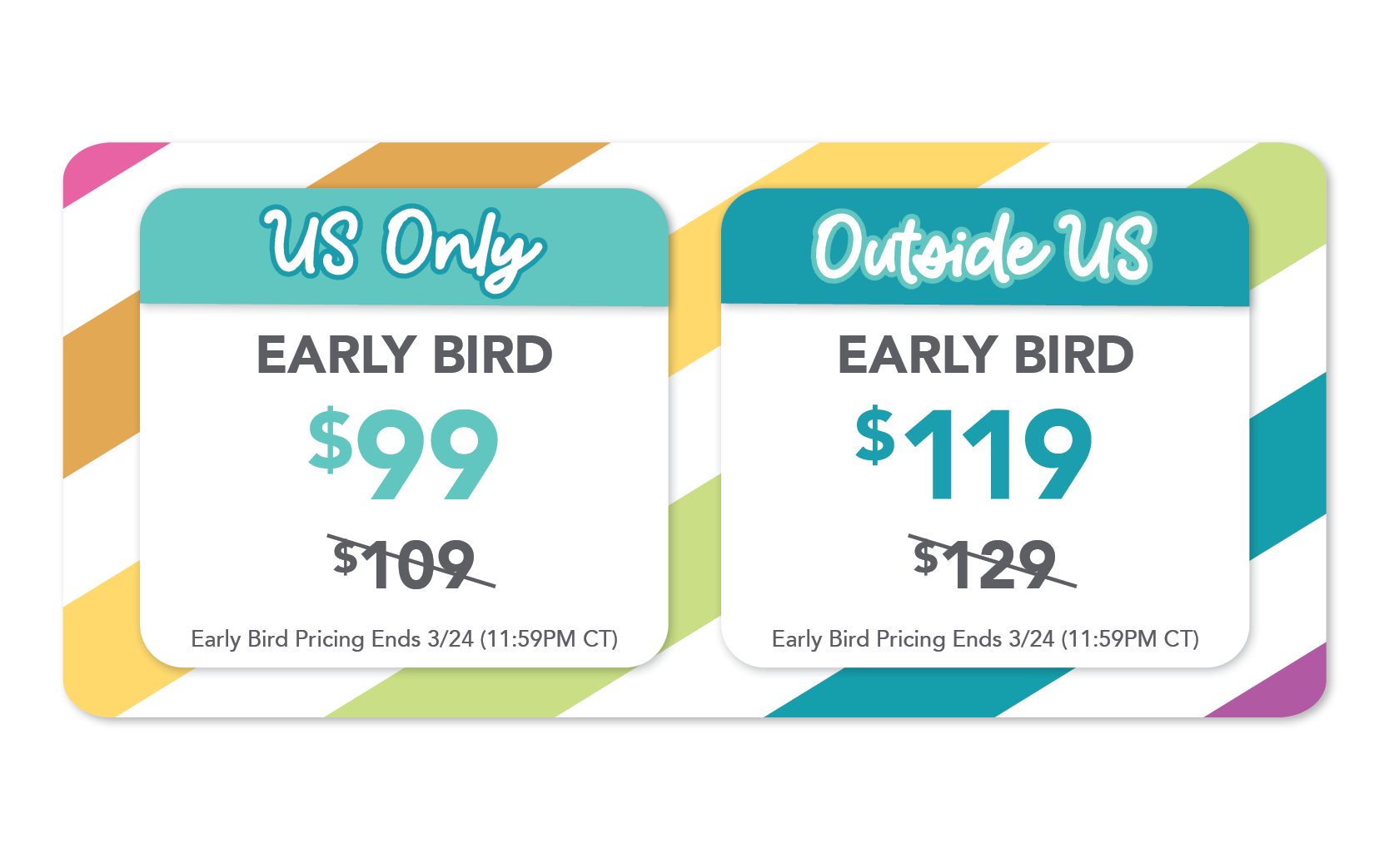 Sign up before March 25th and enjoy Early Bird pricing: $99 for US shipping and $119 for International shipping!